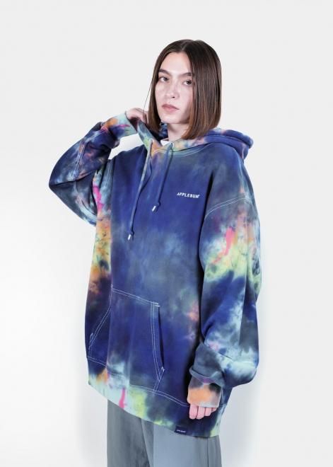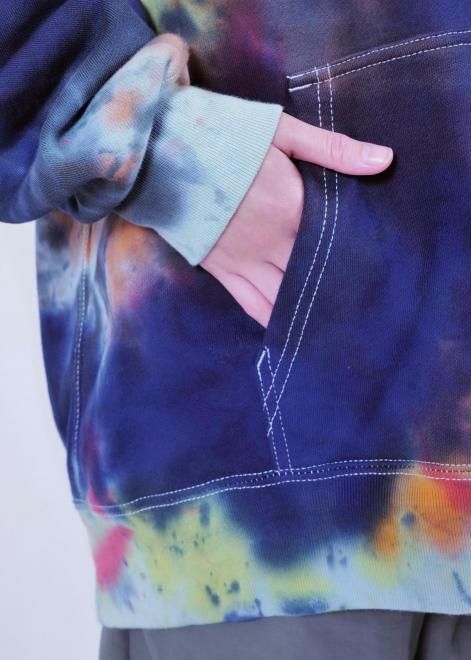 通常の絞り染めとは異なり、ランダムにシワを寄せて染色することでタイダイ感を抑えた独特な風合いを実現したタイダイスウェットパーカー。