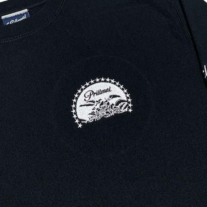 フロント左胸にはCHILL MOUNT、左袖にはPrillmalロゴが刺繍されたクルーネックスウェット。